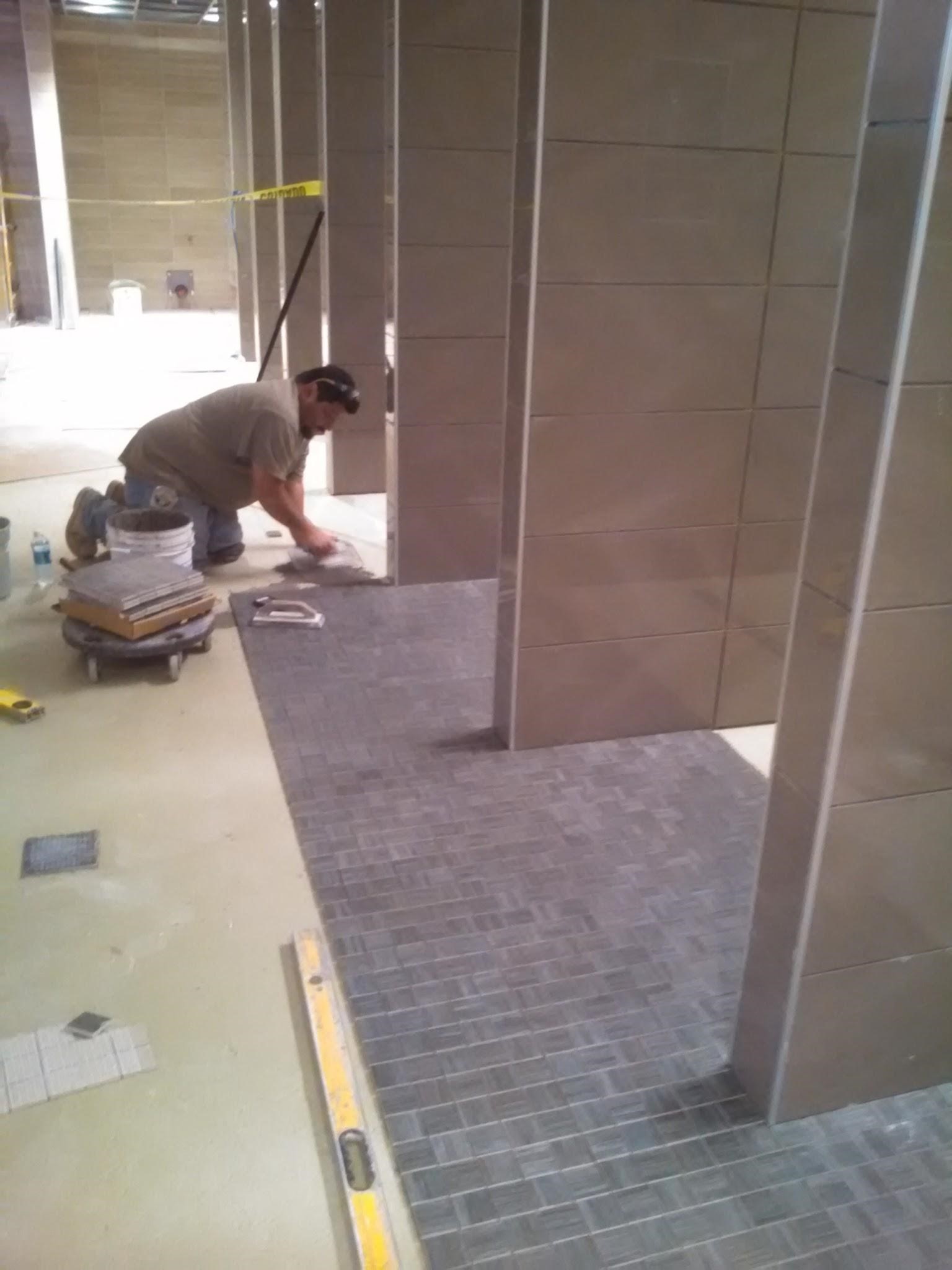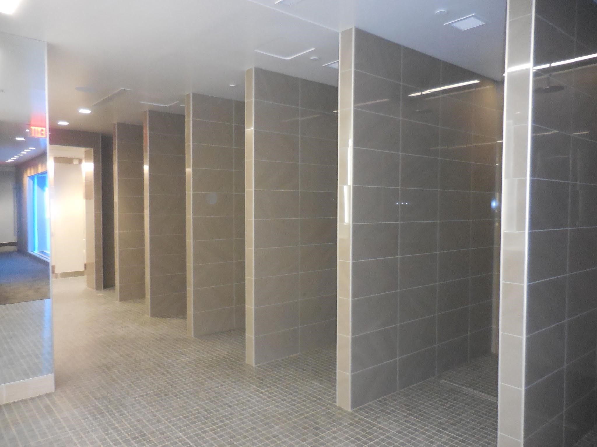 Nearly 6,000 square feet of large format, glass and mosaic tiles were installed by Neuse Tile during the locker room renovation, each with associated waterproofing and substrate preparation.