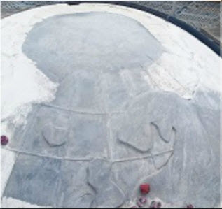 Crews began by saw-cutting the damaged areas and repairing them with a polymer-modified concrete repair mortar. The shapes of the continents and the Globe’s longitude and latitude lines were reformed and finished, under the watchful eye of the artist, to match the existing profile.